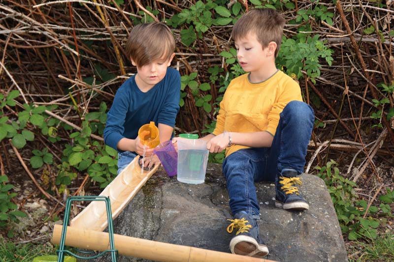 ... Im Nu ist aus den vier Bambus Rinnen eine Wasserbahn gebaut und dann heißt es: Wasser marsch! Bei der Konstruktion können verschiedene Bauteile miteinander kombiniert werden, um Gefälle zu erzeugen (Wasserbahn Ständer), um Wasser umzuleiten (Bilibo) und um das Wasser aufzufangen (Kunststoffkiste). Ob es eine lange gerade Bahn mit viel Gefälle oder eine flache Zickzack-Bahn werden soll, in der das Wasser langsam fließt, können die Kinder immer wieder neu beim Bau entscheiden. Natürlich kann die Bahn beliebig erweitert werden - je länger die Wasserbahn desto größer ist der Spielspaß. Lieferung ohne Deko/Zubehör.