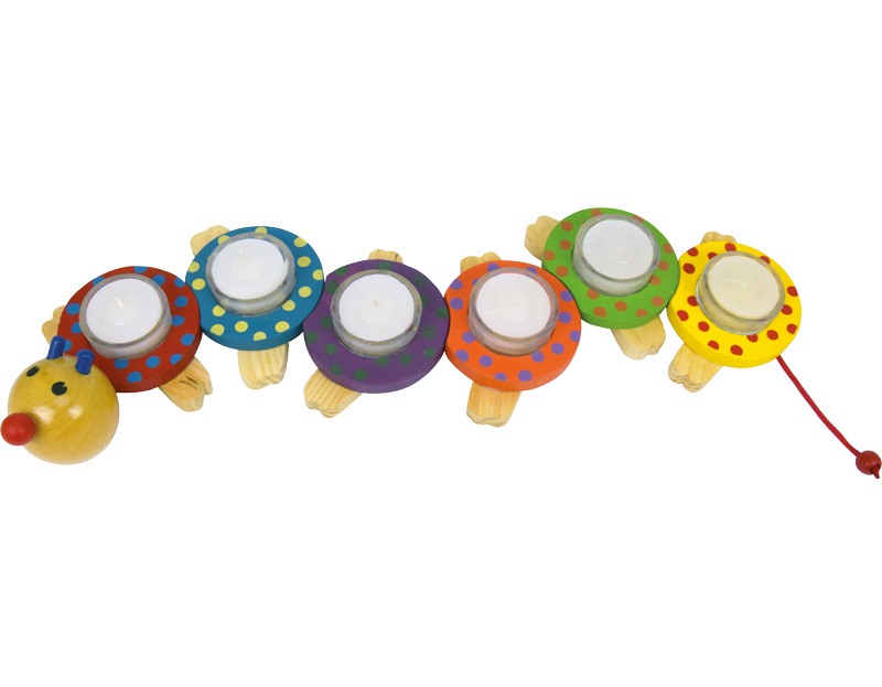 Jahr für Jahr wird ein weiteres Holzelement mit Glasteelicht auf die Kordel gefädelt, bis die Raupe im 6. Jahr komplett ist.
