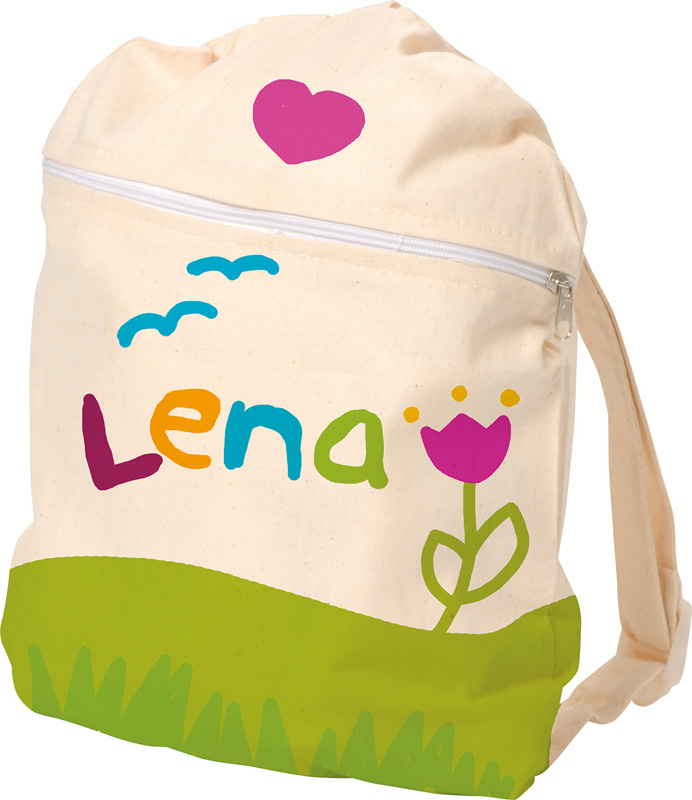 ... mit Reißverschlussfach, Tragehenkel und verstellbaren Trägern aus naturbelassenem Baumwollstoff. Die Große Fläche auf der Vorderseite bietet viel Platz zum Gestalten. Tipp: Namen auf den Tragegriff schreiben um Verwechslungen zu vermeiden.