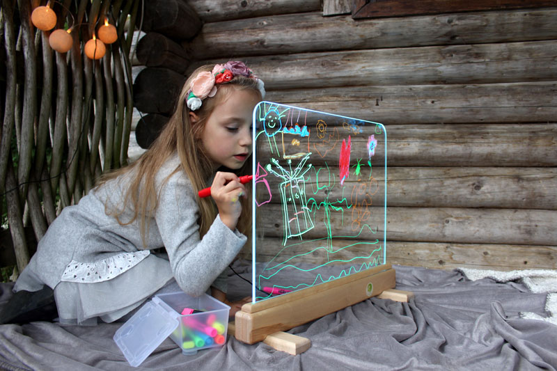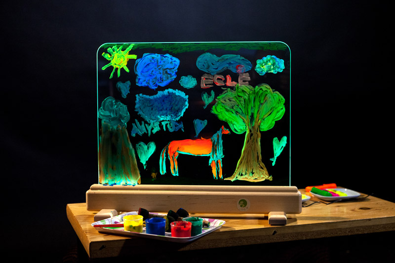 ... die hochwertige Leuchtstaffelei aus Spezialglas ist ein faszinierendes Medium zum Bemalen mit Fingerfarben, Gouache, Aquarellfarben und Leuchtstiften. Sie kann beidseitig von zwei Kindern bemalt werden und lädt so zum Experimentieren ein. Im Fuß aus lackiertem Massivholz ist eine LED Lichtleiste integriert, die das Kunstwerk erstrahlen lässt. Neben weißem Licht sind 15 weitere Farben und 4 Farbwechsel-Modi möglich - das Gemälde erscheint in jeder Lichtfarbe optisch anders. Zur leichten Reinigung mit Wasser kann die Glasscheibe aus dem Holzsockel herausgenommen werden. Die Ecken der Glasscheibe und der Holzelemente sind formschön abgerundet. Inkl. Fernbedienung, Gebrauchs-/Montageanleitung. Wird zerlegt geliefert (2 Standfüße müssen mit 4 beiligenden Inbusschrauben befestigt werden). Leistung: 14,4 Watt (Netzstecker mit Trafo). Gewicht: 4 kg.