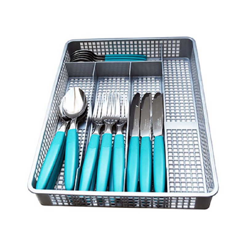 - Menübesteck-Set 25-tlg. IPANEMA türkis, 6 x Menümesser 20,5cm mit scharfer Klinge,, 6x Menügabel 19cm, 6x Menülöffel 19cm, 6x Tee-/Kaffeelöffel 14cm + gratis 1 Besteckkasten Kunststoff Farbe silber, 31 x 23cm, mit 5 Fächern