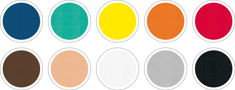 - Farben: weiß, chamois, gelb, hochrot, königsblau, orange, smaragdgrün, hellgrau, schokobraun und schwarz