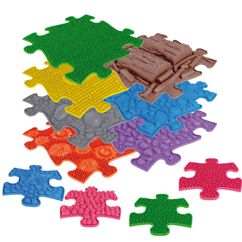 ... In der Natur ertasten Kinder mit ihren Händen und Füßen unterschiedliche weiche und harte Oberflächen beim Schlendern, Laufen, Krabbeln und Rutschen. Dabei machen sie Erfahrungen, die existenziell wichtig für ihre Entwicklung sind. Diese Sensorik-Matten in bunten Farben und diversen Härtegraden imitieren die verschiedenste Untergründe der Natur: Gras, Kiesel, Äste und Muscheln ermöglichen beim barfüßigen Begehen vielerlei Sinnesreize. Die abgerundeten Noppen streicheln, massieren und stimulieren die Reflexzonen auf der Hautoberfläche. Zugleich werden der Gleichgewichtssinn und die Koordinationsfähigkeit der Kinder trainiert. Alle Module passen wie ein Puzzle zusammen - die Kinder können sie individuell kombinieren und mit anderen Sets ergänzen. Das Zusammenfügen der Elemente fördert die Feinmotorik und taktile Wahrnehmung der Hände. Die strapazierfähigen Strukturmatten sind ein wesentliches Hilfsmittel in der Ergo- und Physiotherapie und sowohl für drinnen als auch für draußen geeignet. Inkl. 4 Minimodule: zur Aktivierung wenig ausgeprägter Muskeln und Stärkung des Fußgewölbes für die bessere Balance. Einfache Reinigung mit Wasser.