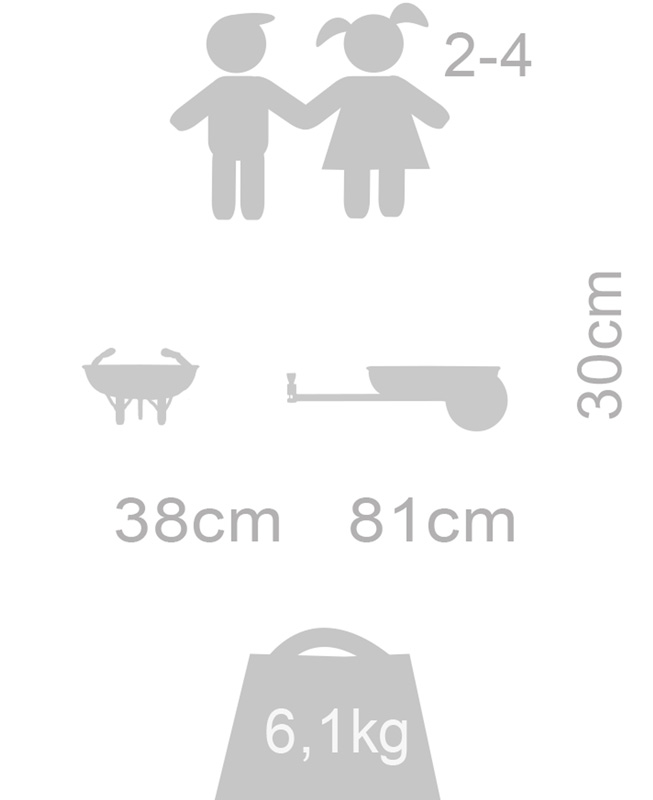 Mit der standfesten Schubkarre können bereits kleine Kinder die unterschiedlichsten Ladungen kippsicher transportieren. Die zwei vorderen Räder und die extra verstärkten Abstellfüße sorgen für optimale Stabilität.
