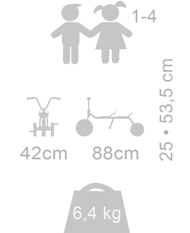 Alter: 1-4 Jahre, Länge: 88 cm, Breite: 42 cm, Lenkerhöhe: 53,5 cm, Sitzhöhe: 25 cm, Gewicht: 6,8 kg Mit dem Taxi können zwei Kinder gleichzeitig zusammen fahren und spielen. Den Spielkameraden am Sandkasten abholen oder in phantasievollen Rollenspielen auf Reisen gehen.